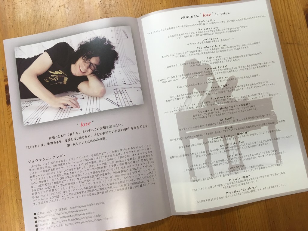 パンフレットには一曲ごとの解説がありました。これはアレヴィ氏がイタリアのコンサートで演奏をする時に「気持ちを集中させるために」少しだけお話をされる内容を、日本語に訳したものです。この日本語訳は日本盤『LOVE』や『HIS BEST』のライナーノーツにも一部書かれています。また、イタリアで発売されている『Allevilive』(2007 Bollettino Edizioni Musicali Srl)には、演奏前のアレヴィ氏のコメントも明瞭に録音されているので、ご興味のある方はお手に取られてみてください。